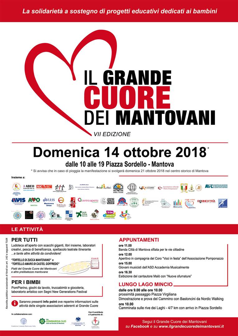 Domenica 14 ottobre in piazza Sordello torna "Il Grande Cuore dei Mantovani", la manifestazione a carattere solidale giunta alla VII edizione, che mette in rete 40 associazioni virgiliane del volontariato.