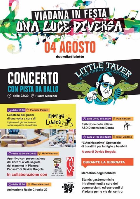 Alle 21, sempre al Muvi, tornerà in scena Bregola, con il suo spettacolo di burattini per bambini e famiglie dal titolo “L’acchiapparime”. Alle 22.30, in piazza Manzoni, gran finale col concerto di Little Taver & his Crazy Alligators. Non mancherà la pista da ballo: Little Taver, ironico e scatenato showman reggiano, propone infatti col suo spettacolo una sorta di omaggio al rock’n’roll americano anni ’50 e agli “urlatori” italiani anni ‘60. Non mancherà il mercatino degli hobbisti. Per l’occasione, negozi aperti.